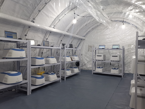3月19日清晨,团队及物资到达怀化后,又迅速投入到气柱式帐篷实验室安装工作中,并于当日全部建成投入使用。该实验室日最高检测样本量达到3万管以上,按照10混1的检测方式,每日最高检测样本量达30万人份。